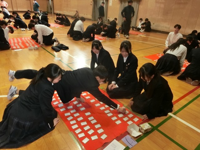 競技がスタートしました。上の句が読まれると、集中モードに入って下の句の札を探します。上手く見つけたら「はいっ!」と元気良く意中の札をゲット!皆さん、週末の午後のひとときを楽しんでいますね。