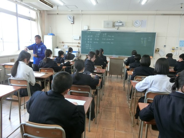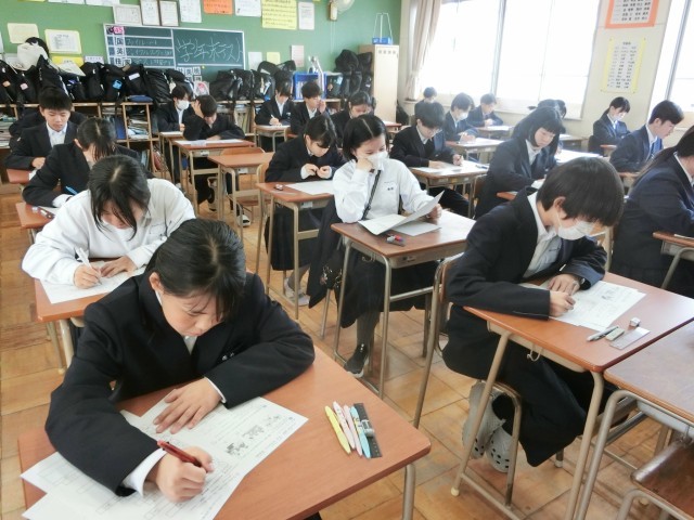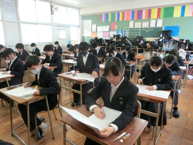 テスト2時間目。1年生の皆さんが英語科のテストを受けています。まずは「リスニングテスト」から。耳を澄ませて、スピーカーから流れる英文を聞き取っています。いくつかの選択肢から正解を選ぶ問題もあるようです。前もって選択肢をチェックすると回答しやすいですよ。