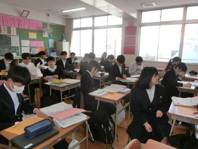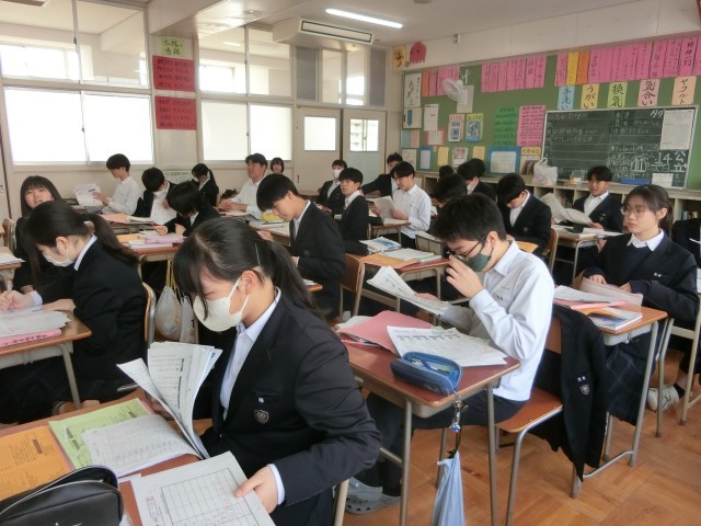 3年生国語の授業で、3学期に配られた学習プリントを整理しています。漢字や四字熟語・文法に教科書の作品に関するワークシートなど、今学期だけで33種類のプリントに取り組みました。皆さん、全てのプリントがきちんと整理できていますか?