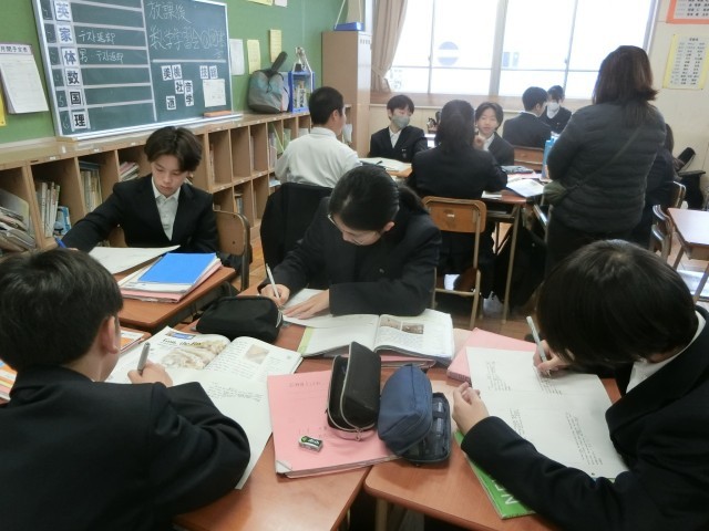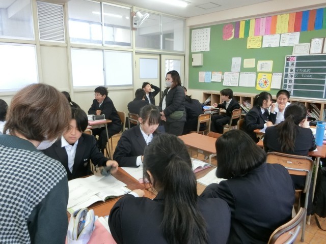 1年生英語の授業で「ごんぎつね」の物語が出てきました。いたずら好きなキツネの「ごん」と村人「兵十」のお話です。今日はグループで役割を分担し、教科書の英文を日本語に訳します。わからない表現はお互いに助け合って訳しましょう。