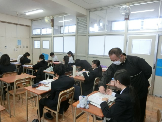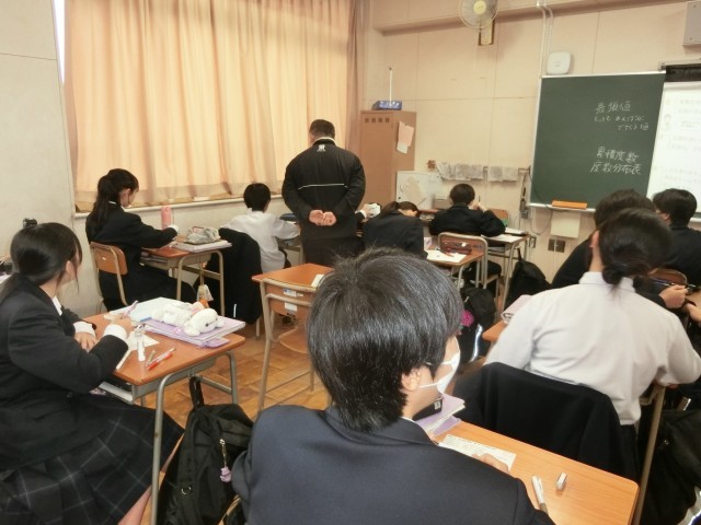 1年生数学の授業で「データの整理・分析」について学習します。プリントにはチームのメンバーが走ったタイムが「度数分布表」に整理されています。皆さん、度数分布表をもとにチームのタイム(記録)の傾向を分析します。どのデータに注目すればよいか、先生に教わりましょう。