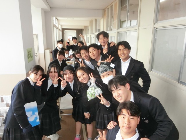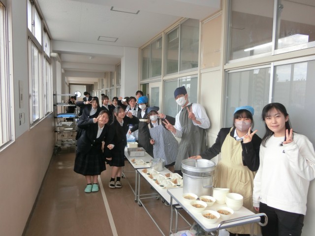午前の授業が終わり、3年生の皆さんが給食の配食を行っています。今日は「いわしフライ・大根と玉ねぎのお味噌汁・ほうれん草のゴマ和え」の和風献立。中学校でいただく給食も今日が最後になりましたね。