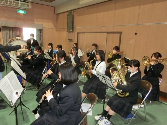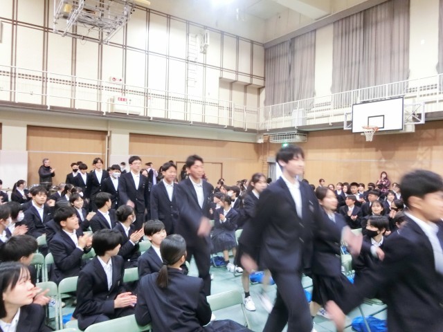 これから「卒業生を送る会」が始まります。吹奏楽部の皆さんが体育大会の入場行進の曲を演奏してくれています。軽快なマーチに合わせて、卒業生が入場してきました。 (上から) 吹奏楽部 ・ 3年1組 ・ 3年2組