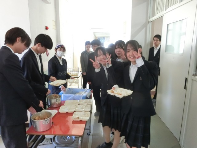お昼休みのチャイムが鳴り、2年生の教室前で給食の配食が行われています。今日は「鶏の八丁味噌がけ・五目汁・切干大根の炒め煮」の和風メニュー。八丁味噌は大豆と塩のみを原料にしたお味噌です。愛知県岡崎市が主な産地で、江戸時代から生産されている伝統的な食材だそうですよ。