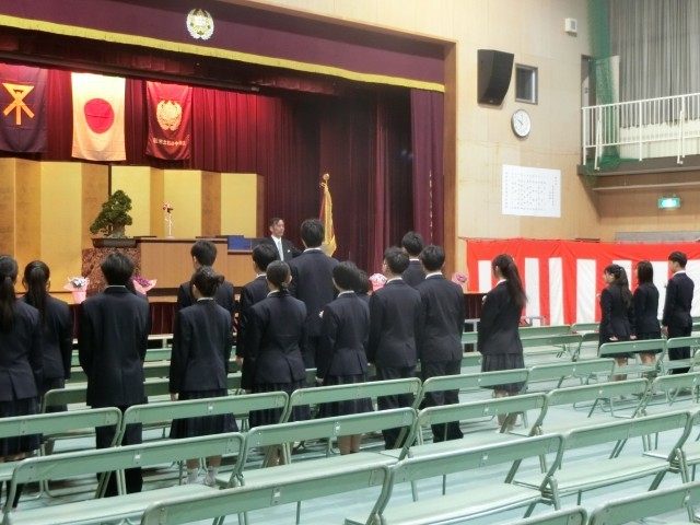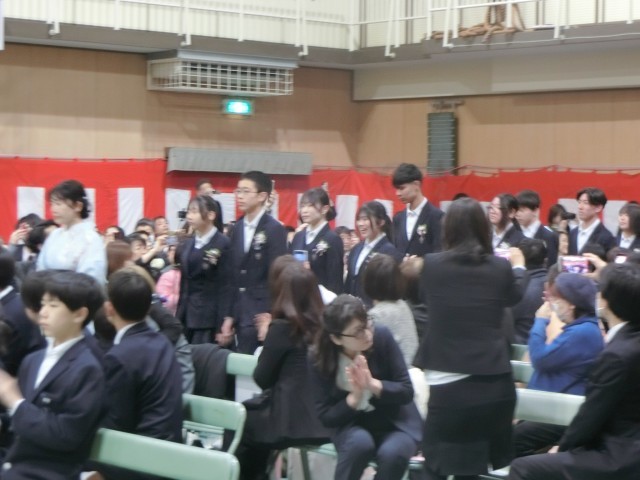 まもなく卒業式が始まります。式場に卒業生が入場してきました。学生服の胸ポケットには可愛いコサージュが飾られ、華やかな雰囲気を演出しています。皆さん笑顔で入場しているのが良いですね。