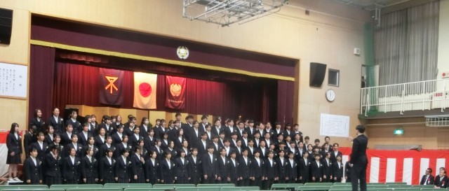 式のクライマックスは卒業生全員で歌う「別れの歌」。今日は「栄光の架け橋」「旅立ちの日に」の2曲を歌います。指揮者もピアノ伴奏も卒業生が担当します。中学校生活最後の学年の取り組みになりました。