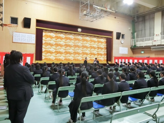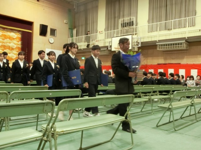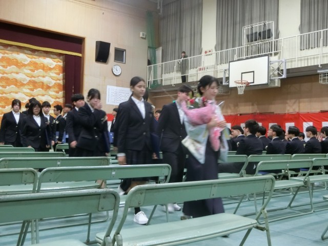 卒業生が「お別れの歌」を見事に歌い上げ、式が無事に終了しました。卒業生保護者代表の方から「お礼の言葉」をいただいた後、卒業生が式場を後にします。