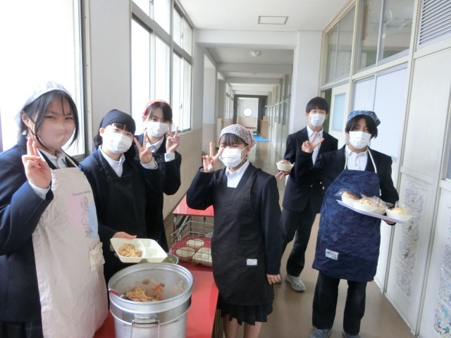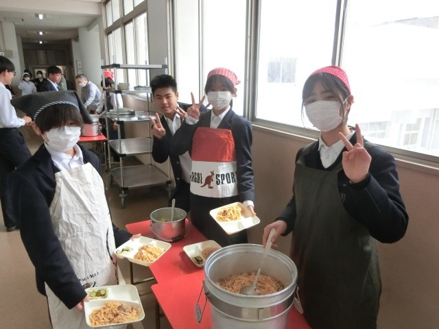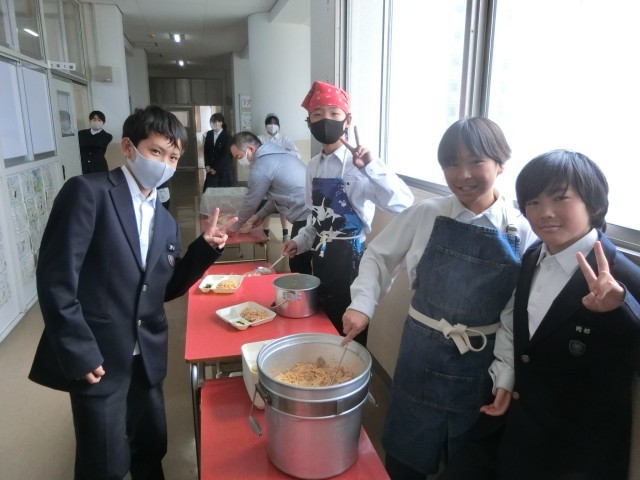 午前の授業が終わり、1年生の教室前で給食の配食が行われています。今日は「鮭とベーコンのスパゲッティ・キャベツとキュウリのサラダ・おさつチップス」をいただきます。鮭フレークとベーコン・タマネギを炒め、クリームシチュー風に仕上げたスパゲッティ。濃厚な味を楽しんでください。