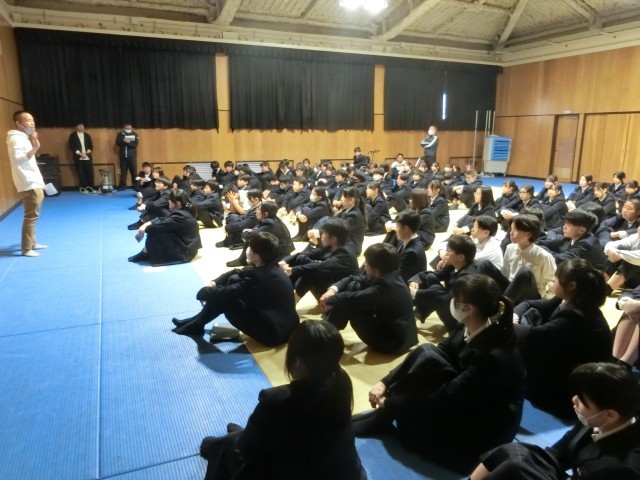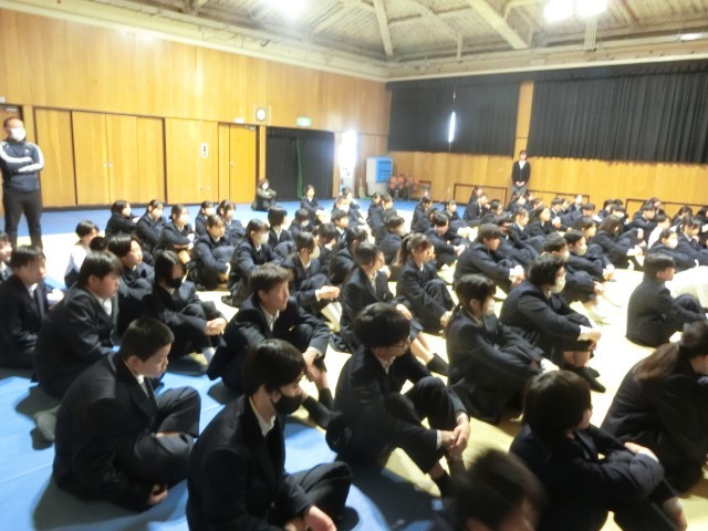 1年生の皆さんが武道場に集まってきました。これから今年度最後の学年集会を行います。4月の入学以降、さまざまな取り組みを頑張ってきました。活動を通して築いた仲間の絆を大切に、2年生でも「明るく元気な9期生」の良さをさらに伸ばしてくださいね。