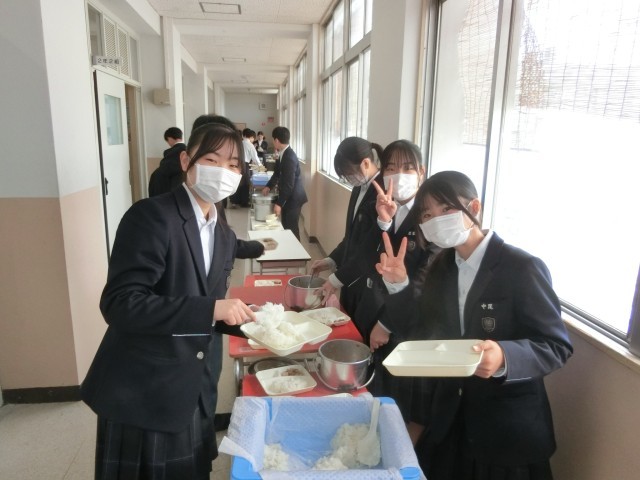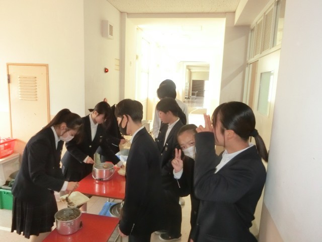 2年生の皆さんも今年度最後の給食の配食中。栄養バランスがしっかり考えられた給食は、皆さんの健やかな成長をサポートしてくれています。来年もみんなと一緒に楽しく美味しくいただきましょう!