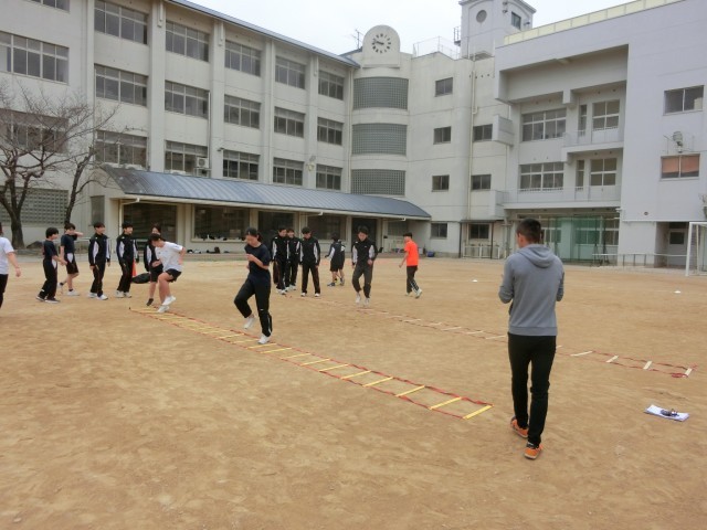 運動場では陸上部の皆さんが「ラダートレーニング」を行っています。はしご状の器具「ラダー」を使っていろんなステップを踏んでいます。着地時の足の感覚や身体全体の動きを磨きます。基礎的な動きをしっかりと身につけましょう。