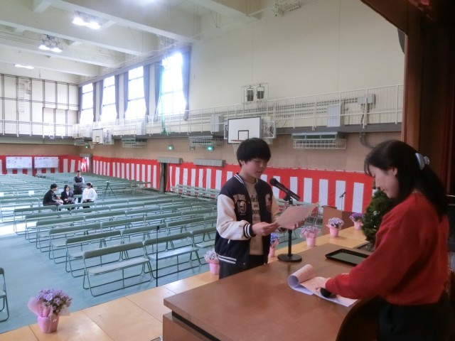 明日の入学式にむけて新入生と在校生がリハーサルを行っています。在校生(新2年生)が歓迎のメッセージを贈り、新入生が中学校生活への抱負や夢を語ります。それぞれしっかりとスピーチしていて、とても素晴らしいですね。明日もどうぞよろしくお願いします!