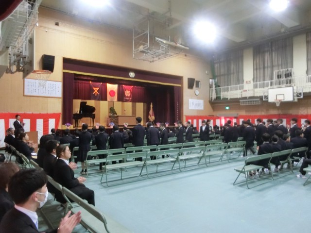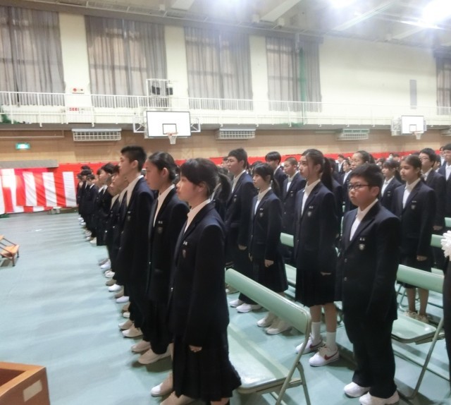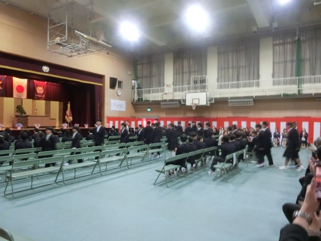 たくさんの拍手の中、新入生が入場してきました。少し大きめの学生服に身を包む姿が初々しく感じられます。