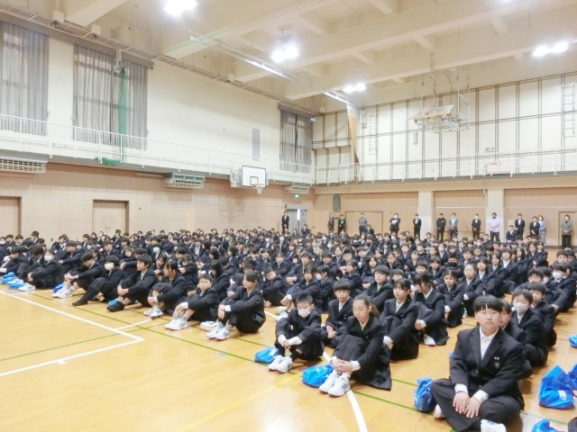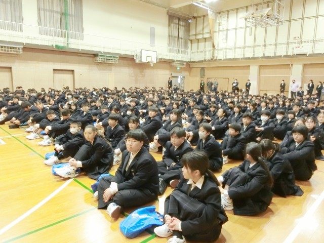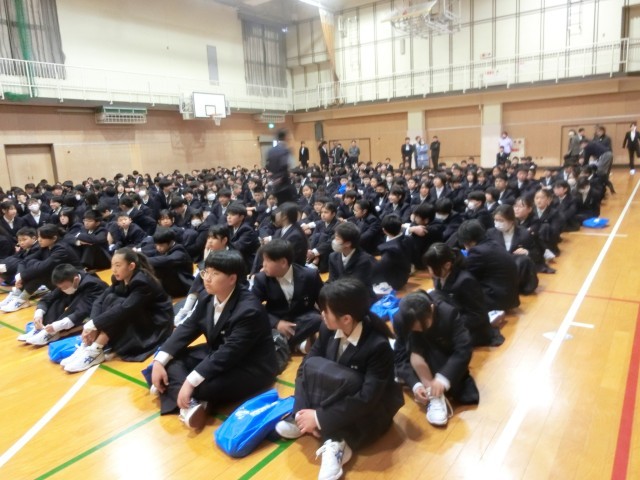 体育館に全校生徒が集まってきました。まもなく令和8年度始業式が開式します。体育館では「体育館シューズ」を履いて行動します。新入生の皆さん、中学校でのいろんな習慣に慣れてくださいね。