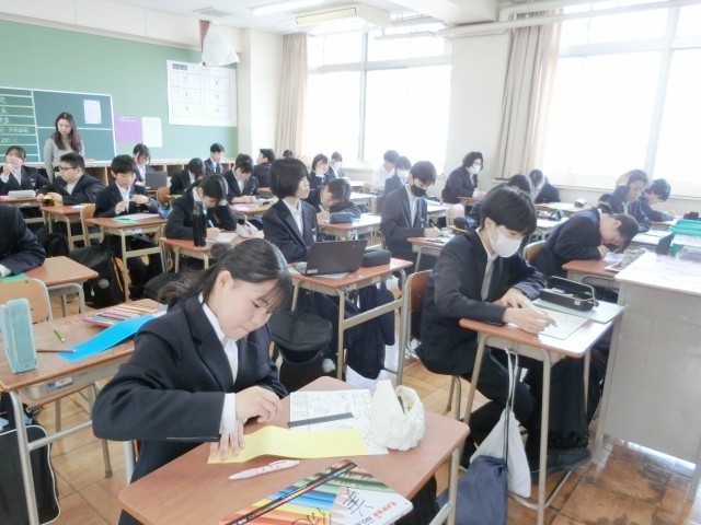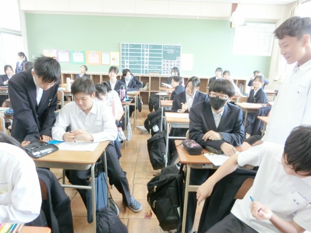 2年生の皆さんが学級活動を行っています。まずは自己紹介カードや今学期の目標を製作しています。クラスメイトに趣味や特技、長所や短所など自分のことを紹介するカードです。皆さん色を塗ったりして、上手く工夫していますね。