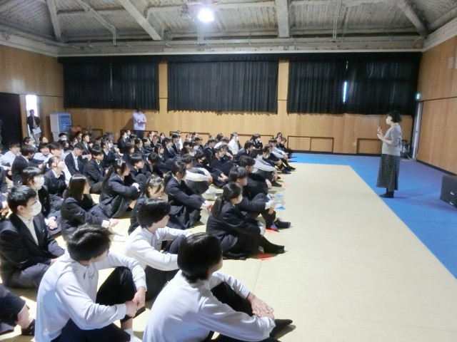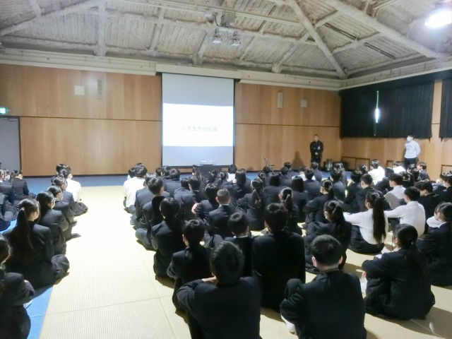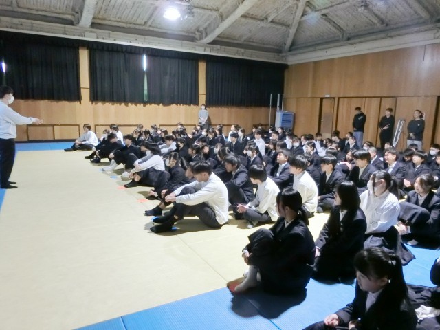 3年生の皆さんが学年集会を開いています。まずは学年の先生方から1人ずつお話を聞いています。楽しみな「修学旅行」も来月下旬に実施予定。さっそく旅行に向けた取り組みに取り掛からないといけませんね。