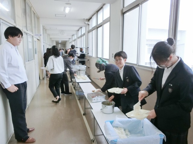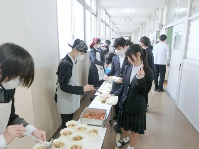 午前の授業が終わり。3年生の皆さんが給食の準備を行っています。今日は「マグロのオーロラ煮・豚と野菜の煮物・キュウリの柚子風味」の和風献立。でん粉をまぶしたマグロをサッと揚げてソースをからめたオーロラ煮。濃い目の味付けが白ご飯にぴったりですよ。