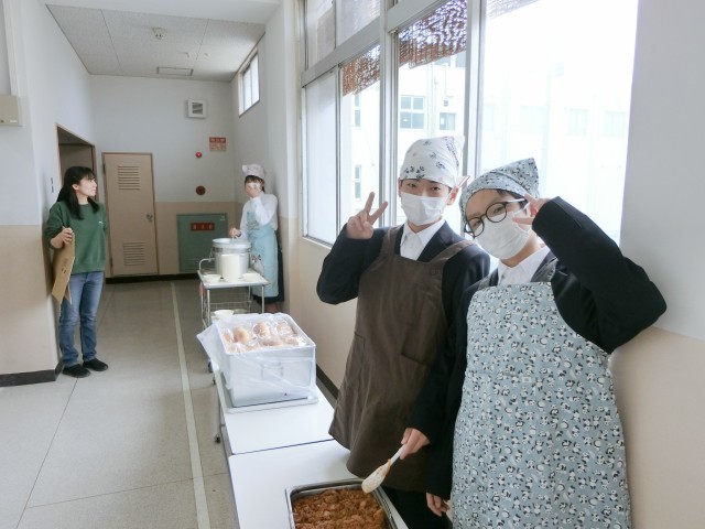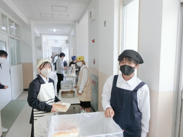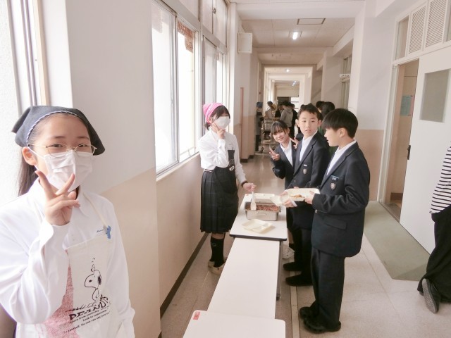 お昼休みのチャイムが鳴り、1年生の教室前で給食の配食が行われています。今日は「じゃがいものミートグラタン・レタスのスープ・豆昆布」の洋風献立。牛と豚のひき肉とたっぷりのジャガイモをバットで焼き上げたミートグラタン。ケチャップソースの味付けが美味しいですよ。