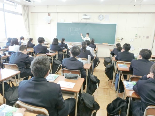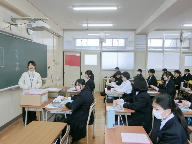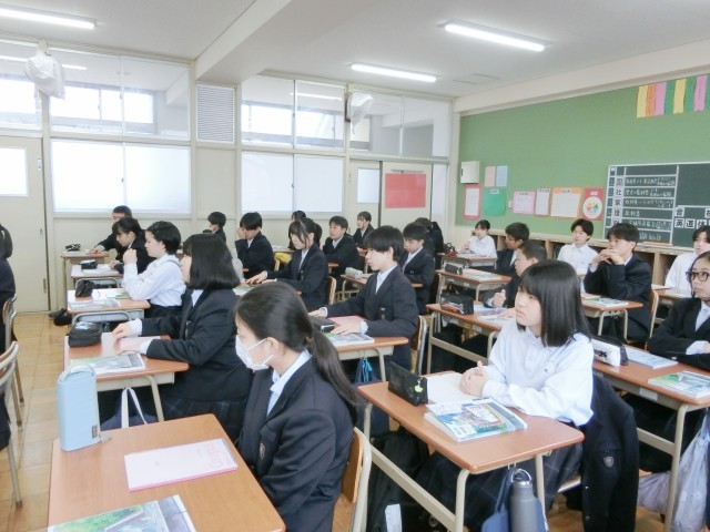 2年生国語の授業に新しい先生が来られました。まず最初に、机の上にセットする教科書やノート・筆箱のレイアウトの説明がありました。効率よく授業を受けるコツだそうです。確かに机の上がスッキリとした感じになりますね。