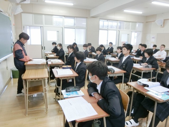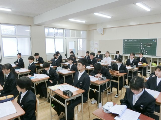 1年生の教室で、先生から「授業を受ける際の心得」を聞いています。授業中の先生の説明を聞く中、「これは大切」と思ったことをノートにメモしておくと、復習するときに役立ちますよ。黒板に書かれたことを写すだけでなく、ノートの取り方を工夫すると学習内容の定着がアップしますよ。