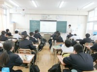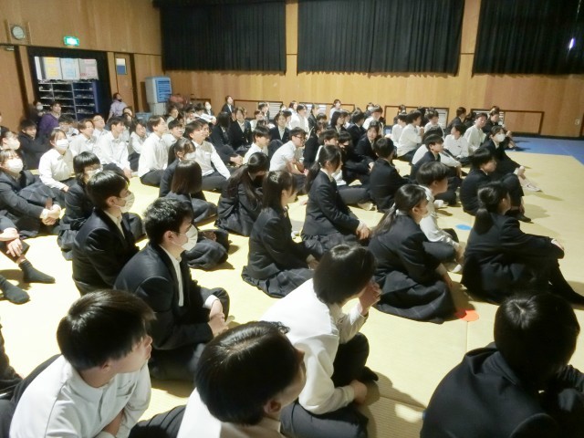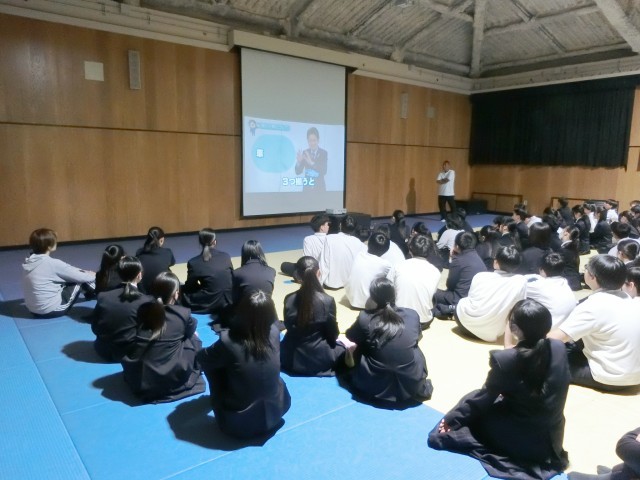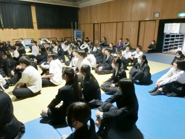 3年生の皆さんが「自転車に関するルール改正や自転車の安全運転」についてお話を聞いています。この4月から自転車の交通違反に対する反則通告制度(青切符)が導入されました。対象年齢が16歳異常なので皆さんは対象外ですが、交通ルールを守って、自転車の安全運転を心がけてくださいね。