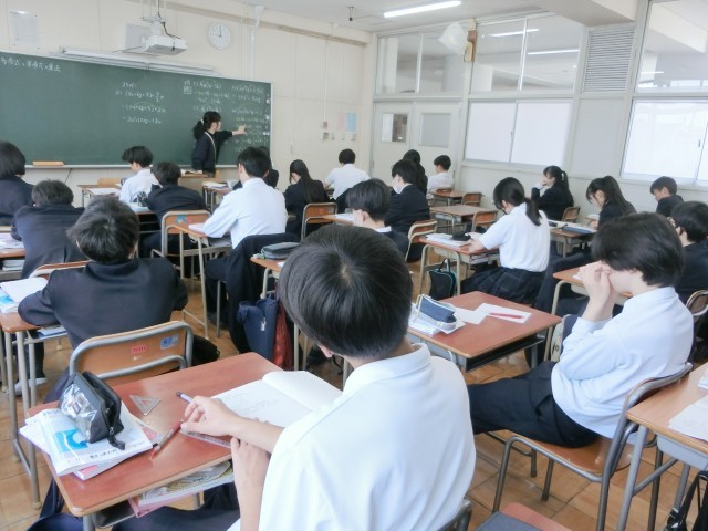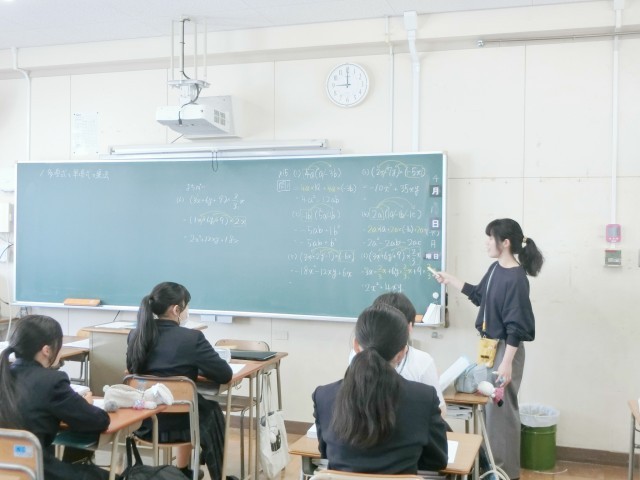3年生数学の授業で「多項式の乗法」について学習中。3x や 2ab など、数や文字の乗法だけの式は単項式、3x+6 など、単項式の和の形の式を多項式と呼ぶそうです。多項式の乗法では、それぞれの項をすべてかけ算する「分配法則」を使うとのこと。皆さん、先生の解説通りに一度やってみましょう。