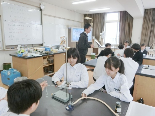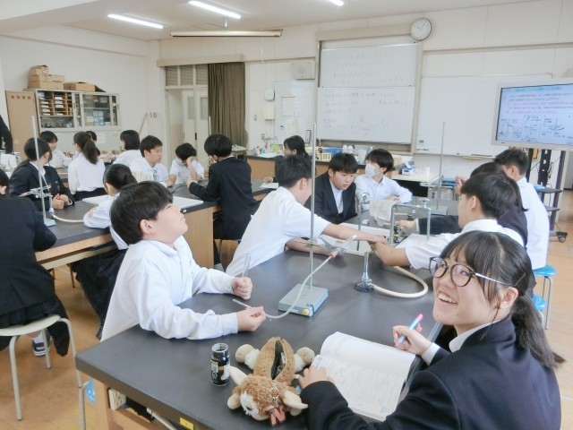 2年生の皆さんが理科室で何やら実験中。炭酸水素ナトリウムを加熱し、発生した気体の正体を考えます。「石灰水を入れてよく振る・マッチの火を近づける・火のついた線香を入れる」などの方法で正体を探るとのこと。皆さん、正解(二酸化炭素)がわかりましたか?