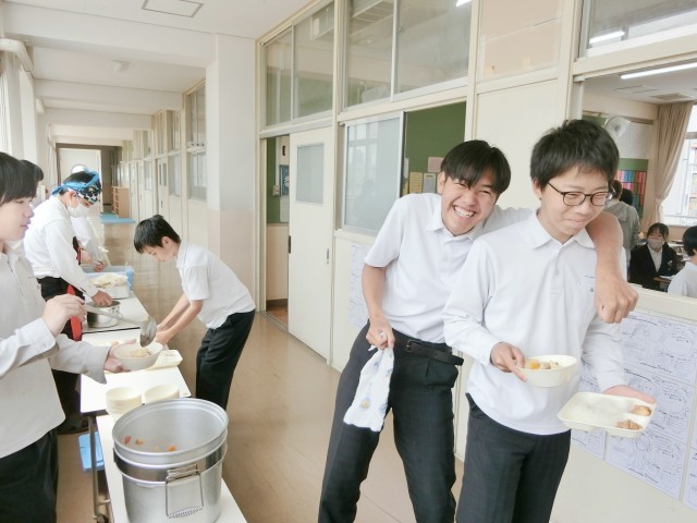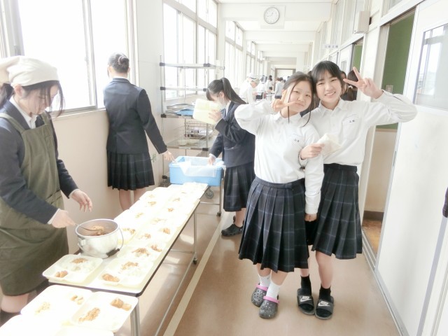 午前の授業が終わり、3年生の皆さんが給食の配食を行っています。今日は「鶏とジャガイモの煮物・厚揚げの醤油がけ・紅サケのそぼろ」の和風メニュー。紅サケそぼろは、炒めたサケに塩・コショウ・お醤油で味付けし、そぼろ状に仕上げました。白ご飯にのっけていただきましょう。
