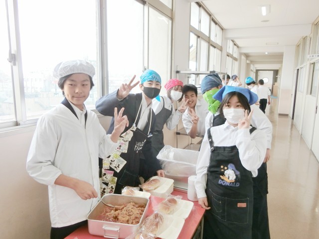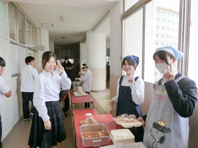 午前の授業が終わり、2年生の教室前で給食の準備が行われています。今日は「煮込みハンバーグ・コーンスープ・おさつチップス」の洋風メニュー。玉ねぎ・マッシュルームと一緒に煮込んだハンバーグは玉ねぎの甘みが溶けだしパンとの相性も良さそう。皆さん、美味しくいただいてくださいね。