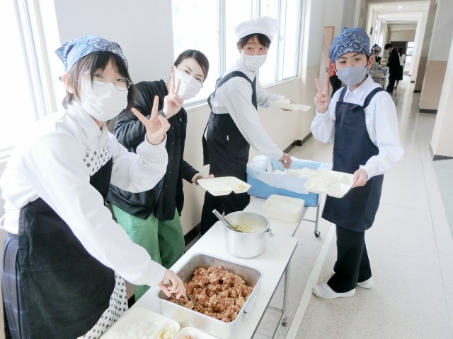 お昼休みのチャイムが鳴り、1年生の教室前で給食の配食が始まりました。今日は「鶏の竜田揚げ・五目汁・キャベツの梅風味」の和風献立。下味をつけた鶏肉にでん粉をまぶしてカラッと揚げた竜田揚げ。サクサクの食感を楽しんでくださいね。