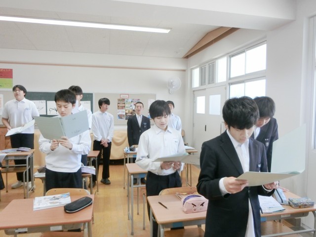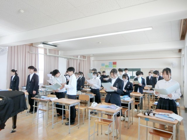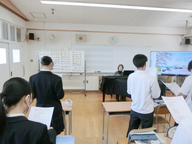 3年生の皆さんが「桃谷中学校 校歌」を歌っています。皆さんの元気な歌声が音楽室に響いています。入学以来、いろんな場面で歌ってきましたね。後輩たちへのお手本になると良いですね。
