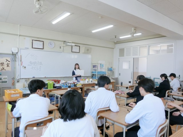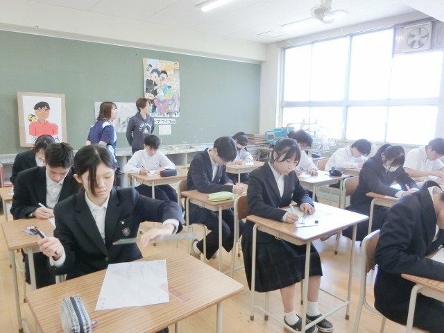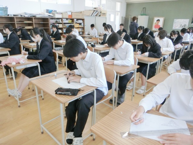 3年生美術の授業で「透視図法」のテストが行われています。大きめの定規が全員に配られ、皆さん作図に取り掛かります。難易度別に3問の問題に取り組みます。テスト時間は30分。ぜひ時間内に完成させましょう。