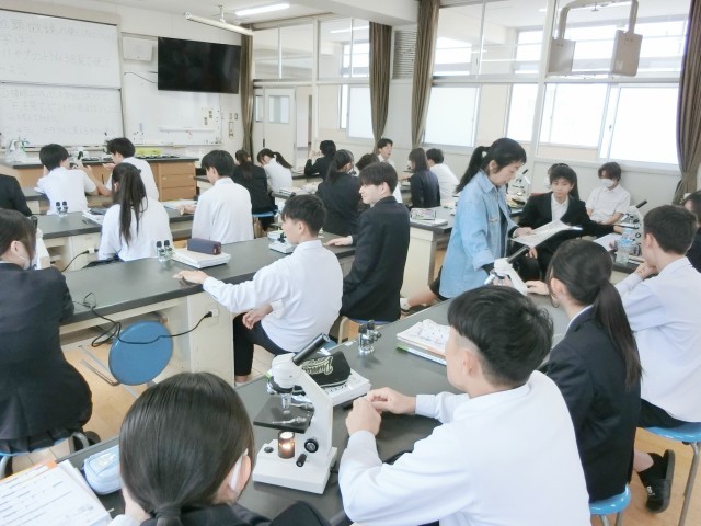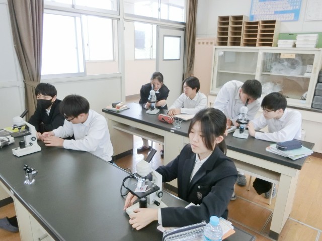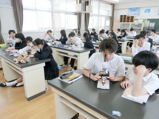 3年生の皆さんが理科室にやってきました。これから顕微鏡を使っていろんなモノを観察します。まずはスーパーのチラシ(印刷物)から。青や赤・黄色などの小さなドット(網点)がたくさん集まって、文字や画像になっていることがわかります。不思議な感覚ですね。