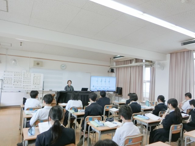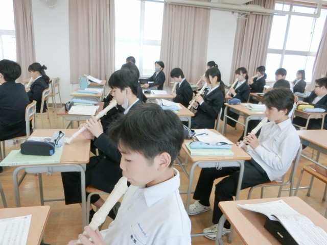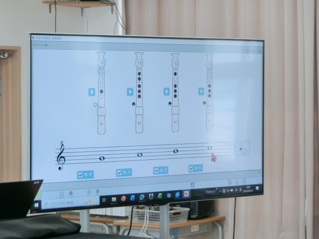 2年生音楽の授業でアルトリコーダーを演奏しています。音楽室のディスプレイには、メロディーに合わせてリコーダーの運指が表示されています。リコーダーの穴をどう押さえればよいか、一目でわかるので良いですね。