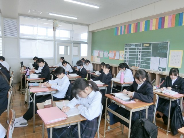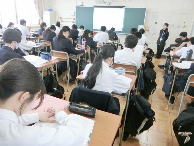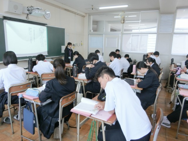 2年生国語の授業で、戸森しるこさんの小説「セミロングホームルーム」を鑑賞します。髪を切りすぎたと悩む主人公と、クラスメイト・担任の先生との関わりを描いた作品です。小説のタイトルに2つの意味があるそうですが、皆さんわかりましたか?
