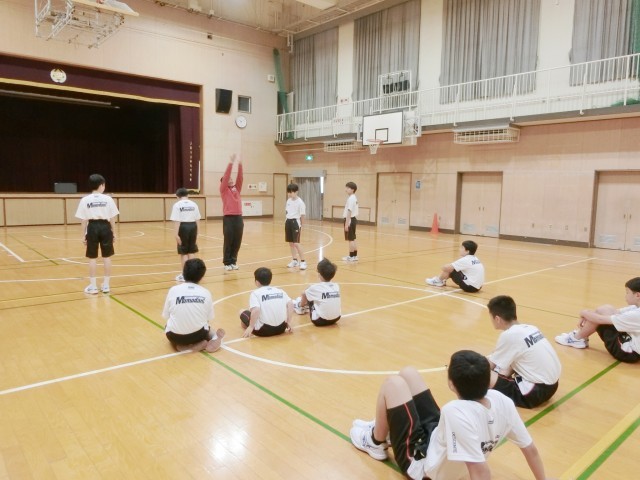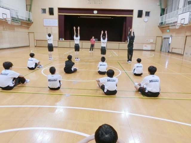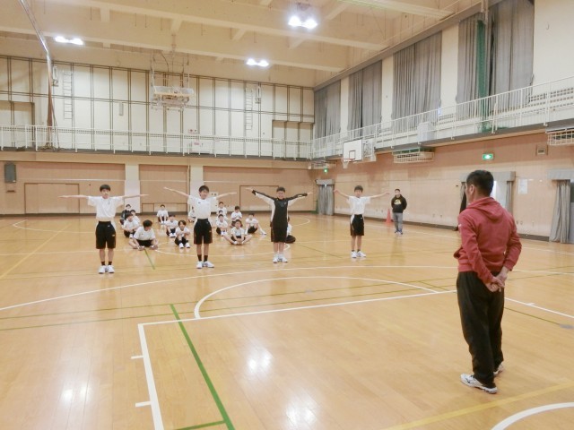 1年生男子体育の授業で「ラジオ体操」の練習を行っています。指先までしっかりと伸ばし、メリハリある動きがポイントだそうです。現在、グループ毎に先生からアドバイスを受けているところ。皆さんの元気なかけ声が体育館に響いていますね。