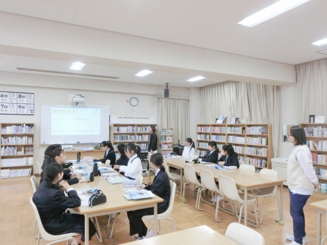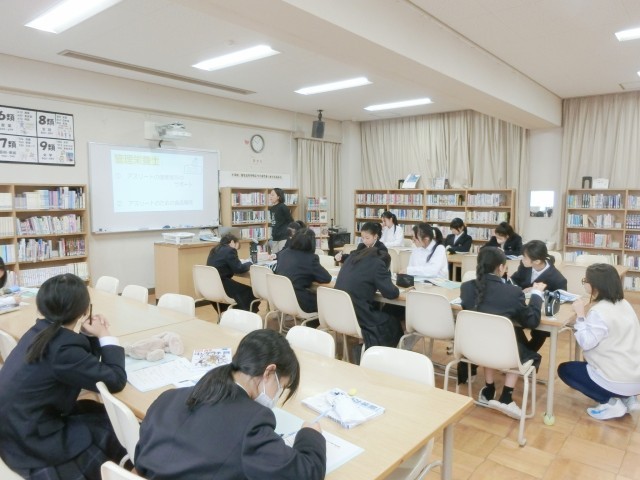 1年生女子の皆さんが「保健」の授業を受けています。まずは健康を保つために大切なことを考えます。「食事・睡眠・運動」の3つが健康維持のポイントになるそうです。生涯にわたって、栄養バランスを考えた食事・適度な運動習慣・良質な睡眠と休養が大切なんですね。