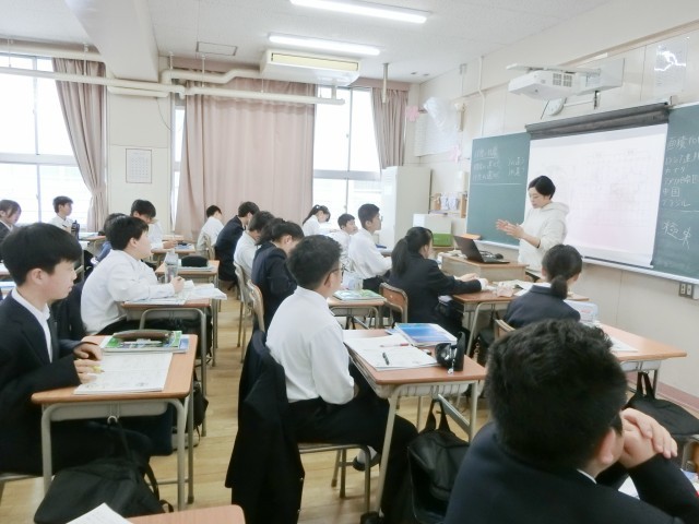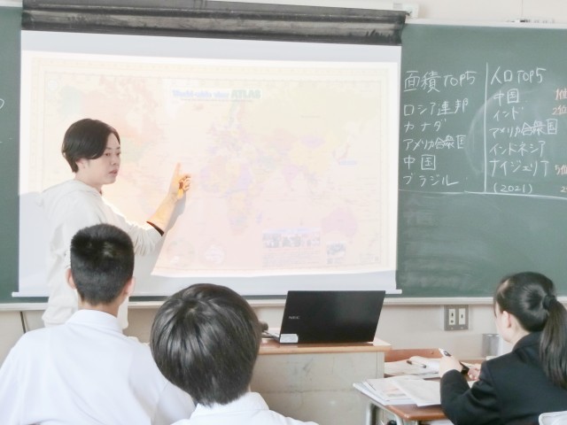 1年生社会の授業で世界地図のルールを学習します。地図を見ると縦・横に線が引かれていますね。地球上の位置を示すための線で、北極と南極を結ぶ縦線を経線、赤道に平行な横線を緯線といいます。