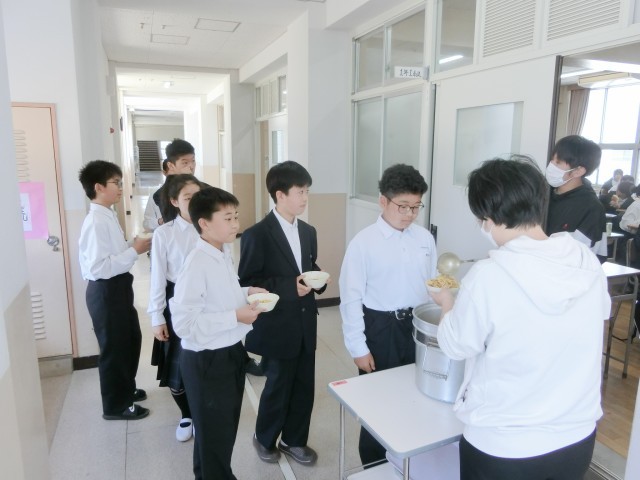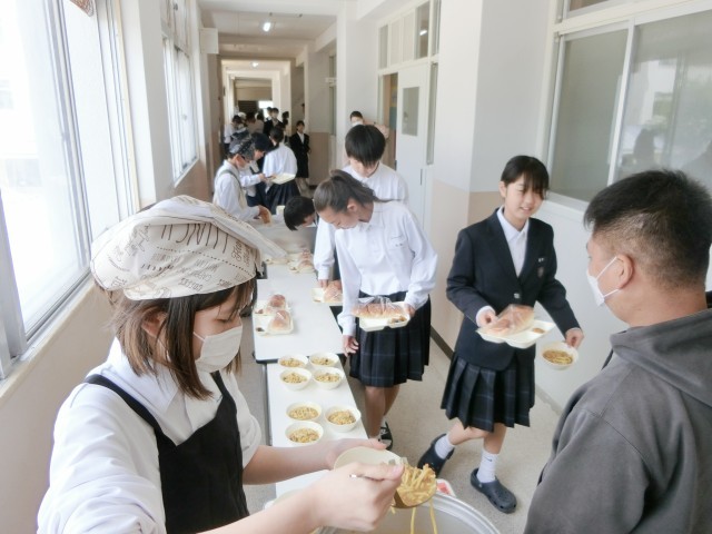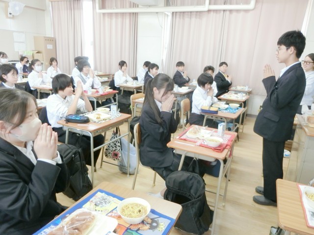 午前の授業が終わり、1年生の皆さんが給食をいただいています。今日は「カレースープスパゲッティ・カボチャのマリネ焼・ミニフィッシュ」の洋風メニュー。鶏肉やベーコンが入ったスープスパゲッティはカレーの香りが美味しそう。皆さん、よければお替りしてくださいね。