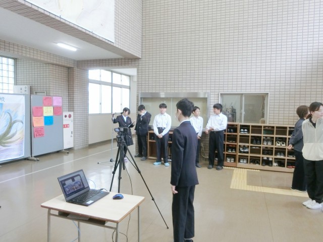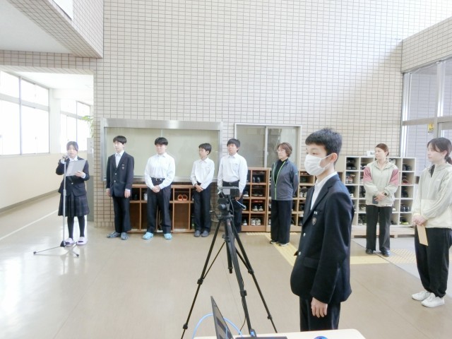 月曜日の朝は全校集会。今朝は玄関ピロティと各教室をオンラインで結んで集会を行いました。「暑い日が増えてきたので、体調管理に気をつけましょう」と生徒会役員さんから呼びかけがありました。運動時のこまめな水分補給等を心がけましょう。