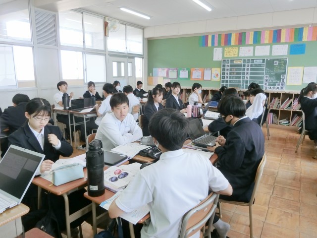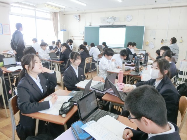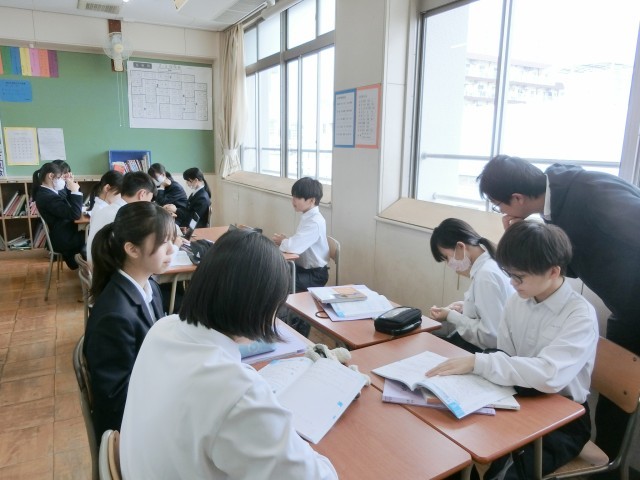 2年生理科の授業でグループ学習に取り組みます。今日はこれまでの学習内容をグループで振り返ります。「原子と分子の違いは?」など、互いに教え合いながら学習内容を確かめ合います。(相手に)わかりやすく説明する力も身に付きますね。