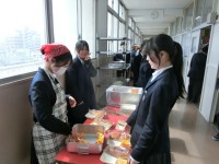 お昼休みのチャイムが鳴り、1年生の教室前で給食の準備が始まりました。今日は「豚と...