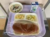 パン 牛乳 ほうれんそうのクリームシチュー キャベツのサラダ 洋なし(...