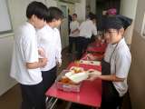 4時間目の授業が終わり、1年生の教室前で給食の配膳が始まりました。今日は「エビの...