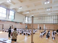 1年生の皆さんが体育館に集まり、発育測定(身長・体重の測定)を受けています。中学...
