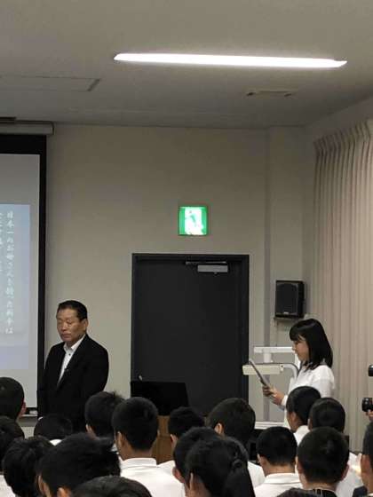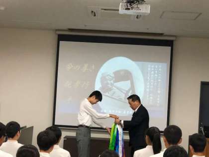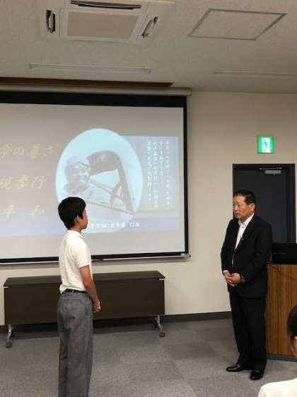 語り部さんのお話を聞いた後、お礼のことば・みんなで作成した折鶴を贈呈しました。