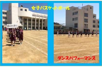 まずは、女子バスケットボール部の入場。本部前まで行進し、あいさつを終え、運動場真ん中で、ダンスを披露。