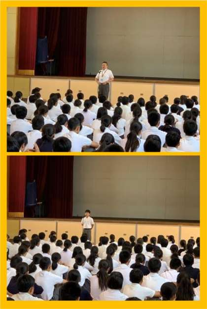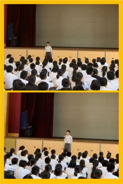 2年学年代表から「地下鉄ラリーを班新聞に仕上げました」、美化委員から「金曜日の6時間目に地域清掃を実施します」、生徒会から「期末テストまで2週間しっかり勉強しましょう」とお話がありました。(教頭)