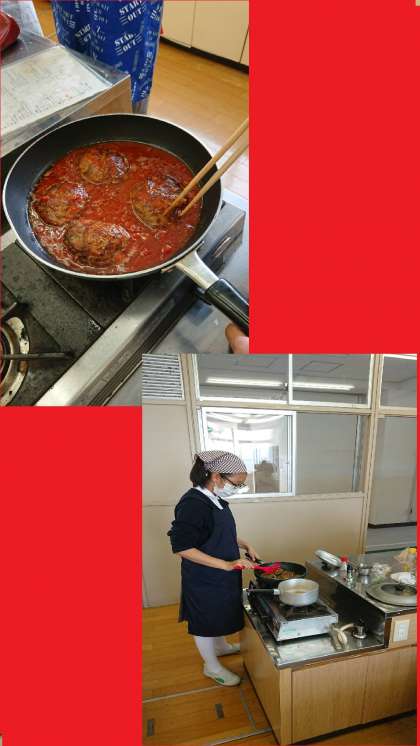 2年生の家庭科の授業で、調理実習を行いました。今日は、2年3組でした。献立は、煮込みハンバーグ、さやいんげんのソテー、にんじんのバター煮、キュウリの和え物でした。とても美味しくできました。(担当:浦久保)