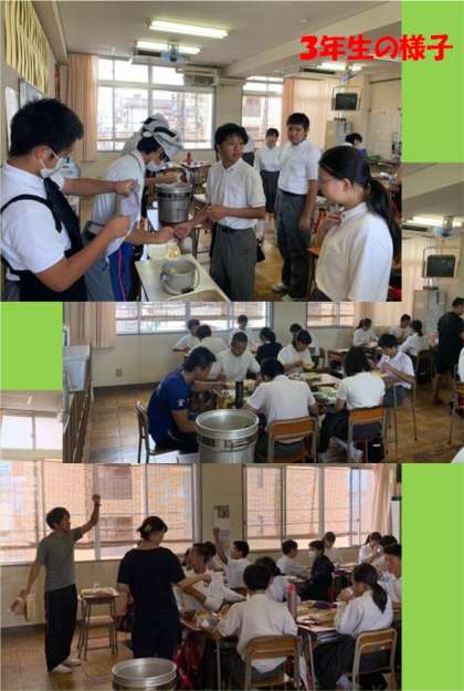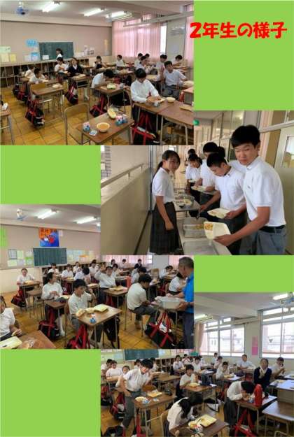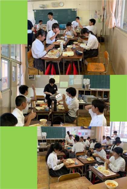 本日の給食は、「いかてんぷら」・「フレッシュトマトのスープ煮」・「サワーソテー」・「ブルーベリージャム」・「パン」・「牛乳」でした。写真は2,3年生です。美味しくいただきました。